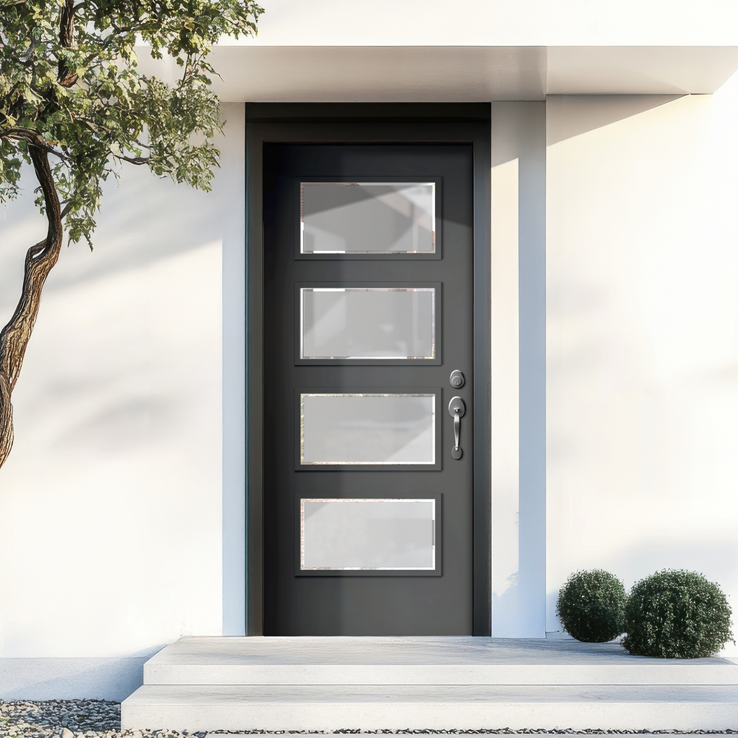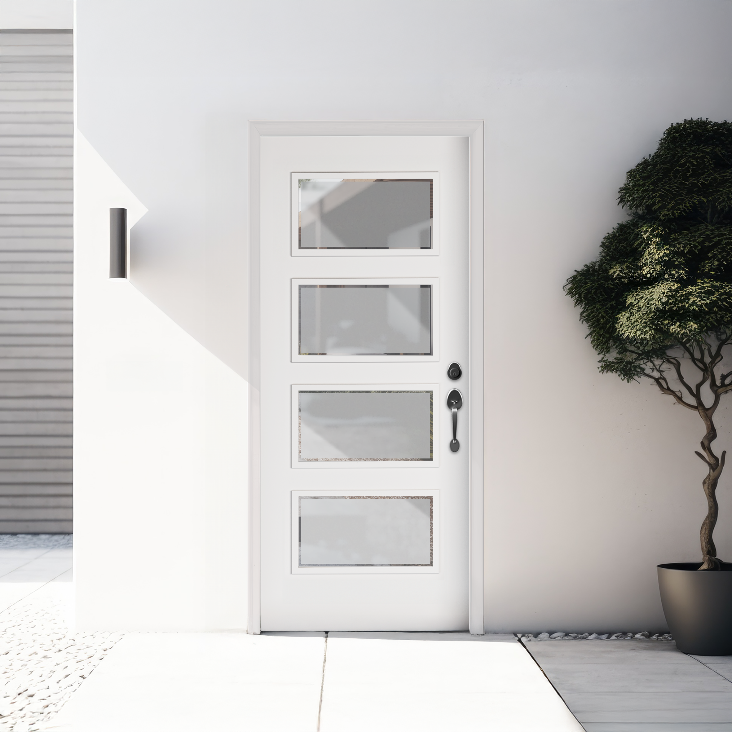 This door, featuring four sandblasted glass panels with clear edges, strikes the perfect balance between privacy and light. The frosted glass panels offer enhanced seclusion, gently diffusing light while keeping your space bright and airy. The clear edges provide a subtle, modern contrast, drawing attention to the door’s clean, geometric design. With its thoughtful arrangement of smaller panels, the door ensures more privacy making it ideal for spaces where separation is desired without sacrificing style or natural light. Its minimalist aesthetic complements any interior, adding a touch of modern sophistication while maintaining a sense of openness.