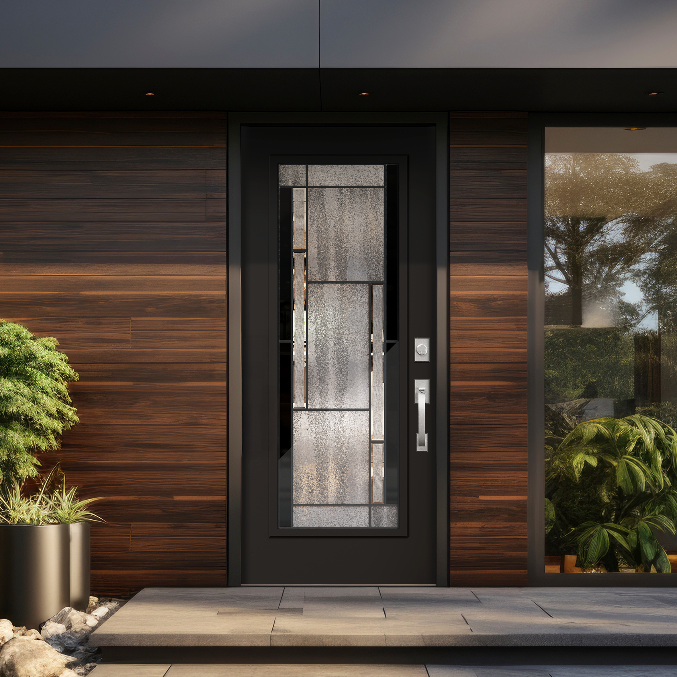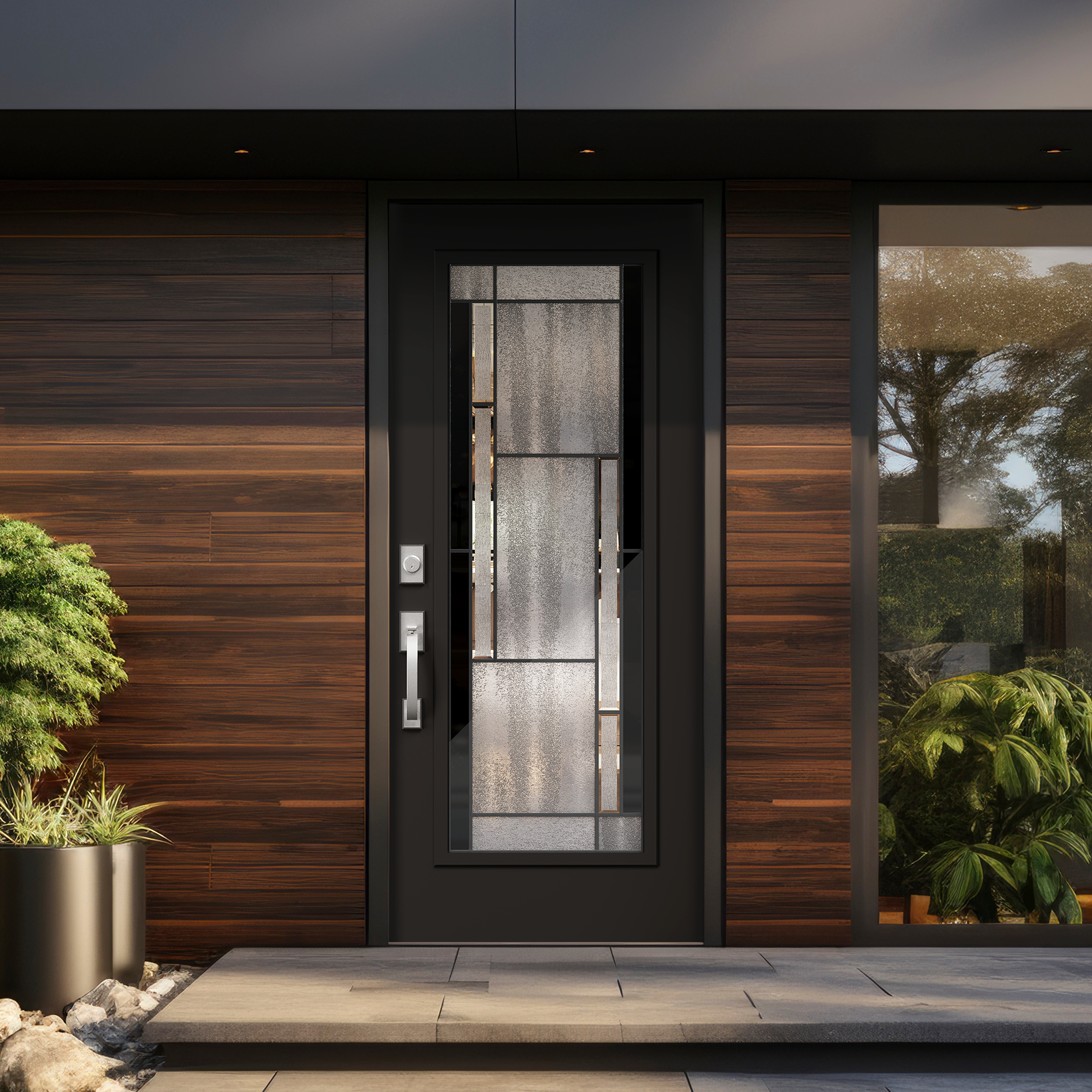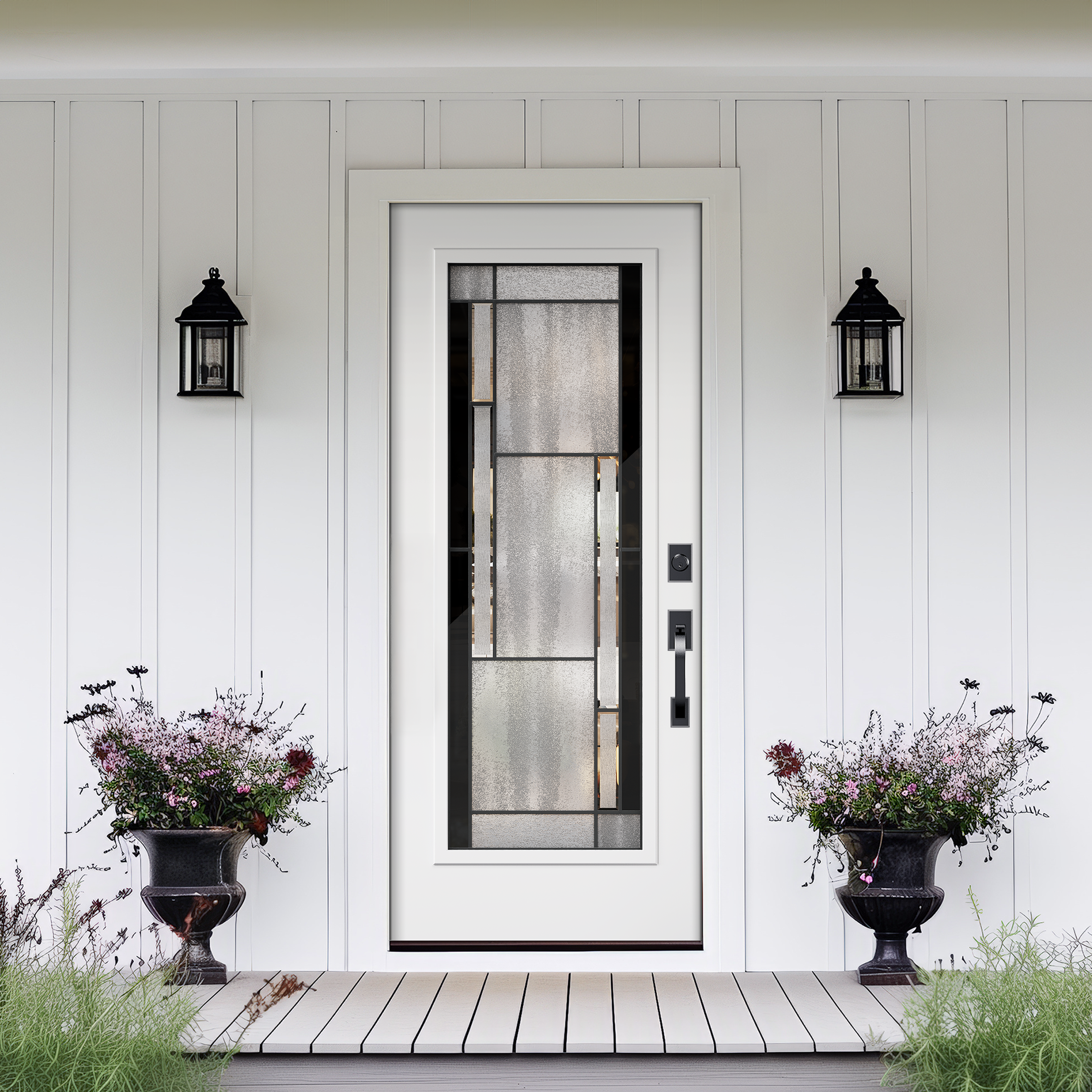 This contemporary glass door features clear glass panels with sleek black glass accents on each side. The design combines openness with a bold contrast, creating a modern aesthetic. The black glass adds sophistication while offering subtle privacy. It's a stylish choice for any modern space.