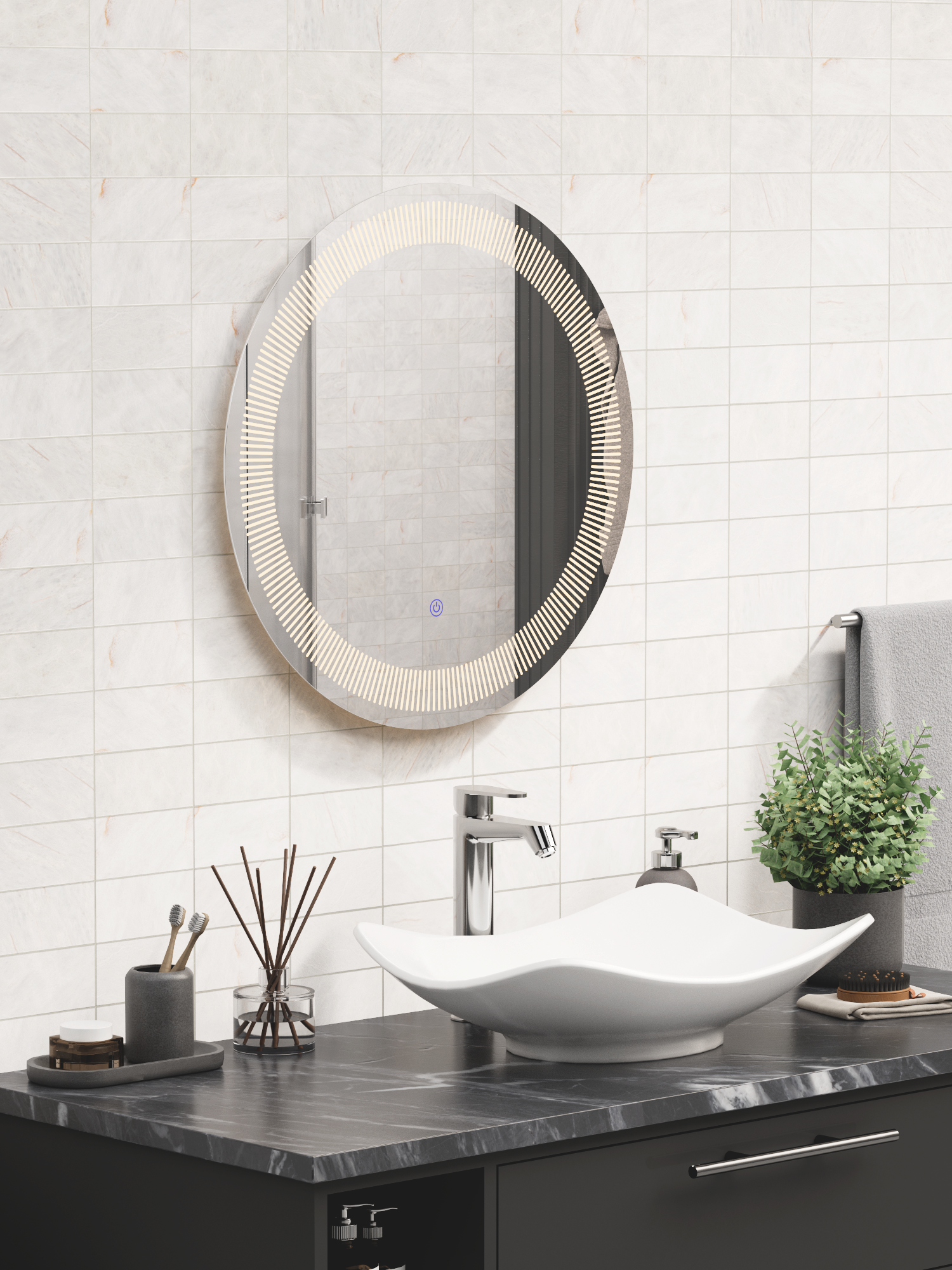 With its timeless round design, the Élise Mirror combines classic elegance with modern functionality. The integrated LED lighting allows you to switch between warm, neutral, and cool tones to suit any moment. Available size: 23" Light color: Tricolor (Warm / Neutral / White)